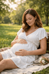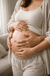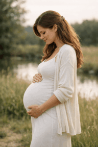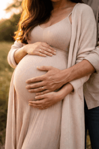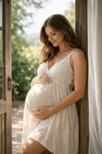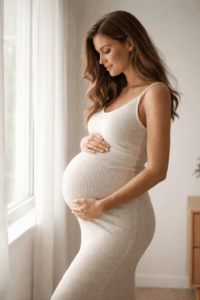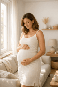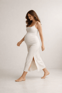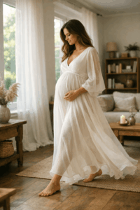 Ein fließendes Kleid, das deinen Bauch sanft umspielt, ist fast immer eine gute Wahl. Besonders beliebt sind lange Kleider mit Stretch oder Wickeloptik, weil sie Bewegungsfreiheit geben und den Bauch schön betonen. Für Zuhause eignen sich auch schlichte Outfits wie ein enges Top mit Strickjacke oder ein weiches Kleid in neutralen Farben.