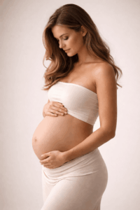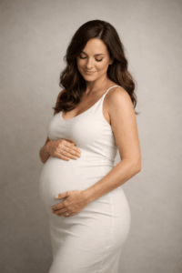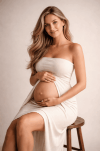 Bei dieser Pose drehst du dich vollständig zur Seite und richtest deinen Blick sanft auf deinen Bauch. Dein Gesicht bleibt entspannt, fast verträumt. Diese Perspektive betont die schöne Rundung des Bauches besonders stark und wirkt sehr emotional.