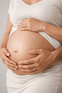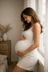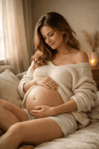 Natürliches Fensterlicht ist ein echter Gamechanger. Stelle dich seitlich zum Fenster, lass das Licht über deinen Bauch fallen und halte eine ruhige Pose. Dein Blick kann nach draußen gehen oder sanft nach unten.