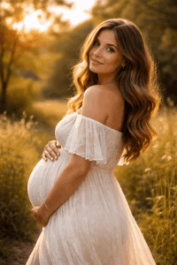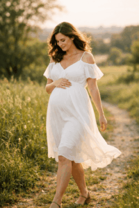 👉 Tipp: Trage ein langes Babybauchkleid* für Fotoshootings in Naturtönen, das speziell für Schwangerschaften geschnitten ist und den Bauch perfekt in Szene setzt.