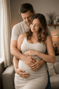 Dein Partner steht hinter dir, legt die Arme um dich und eine Hand auf deinen Bauch. Du lehnst dich leicht an ihn an. Diese Pose wirkt beschützend, ruhig und sehr emotional.