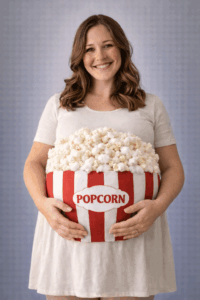 Der Bauch wird zur Popcorn Tüte, oben quellen die Popcorns heraus.