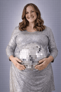 Silbernes Kleid, kleine Spiegel Elemente oder Glitzerfolie auf dem Bauch und fertig ist die Baby Disco.