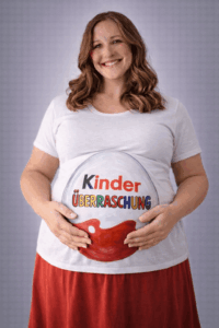 Der Babybauch wird zum Überraschungsei, das Herz symbolisiert das Baby darin. Du brauchst ein weißes Oberteil oder Kleid, malst das typische Überraschungsei Design auf den Bauch und ergänzt es mit einem kleinen Herz oder Baby Symbol.