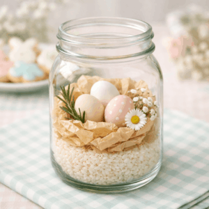 Ein Glas, ein bisschen Füllung, ein Mini Nest, und du hast einfache Osterdeko, die so ruhig und hübsch wirkt
