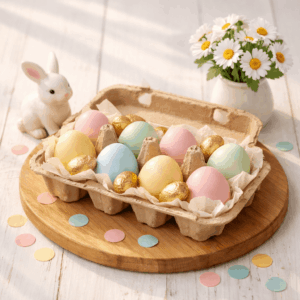 Du nimmst einen leeren Eierkarton, am besten die Unterseite, also den Teil mit den Mulden, und stellst ihn auf ein Tablett, einen Teller, ein Holzbrett oder notfalls auf ein umgedrehtes Schneidebrett, weil alles, was auf einer “Basis” steht, sofort viel ordentlicher aussieht, und plötzlich wirkt das Ganze wie ein kleines Arrangement, statt wie ein zufälliges Stück Pappe.